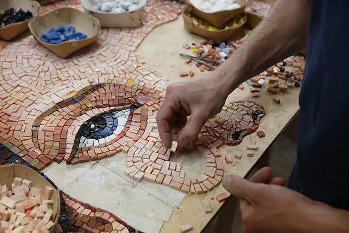 Un mosaico es una forma de arte en la que se organizan pequeñas piezas de materiales, como vidrio, piedra, baldosas u otros objetos, para crear una imagen o patrón más grande. Estas pequeñas piezas, llamadas Tesserae, se colocan meticulosamente y se colocan en una superficie para formar imágenes, diseños o superficies decorativas. Los mosaicos se han utilizado durante siglos, que se remontan a las civilizaciones antiguas como los griegos, romanos y bizantinos. A menudo se usaban para decorar pisos, paredes y techos de edificios, especialmente en espacios religiosos o públicos. El arte de la música puede ser altamente detallado e intrincado, lo que requiere una gran habilidad para lograr la profundidad, el sombreado y el realismo. Todavía se usa ampliamente hoy en formas de arte tradicionales y contemporáneas, a menudo apreciadas por su durabilidad, textura y capacidad para crear efectos visuales impresionantes.