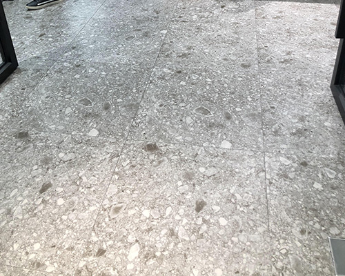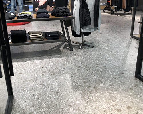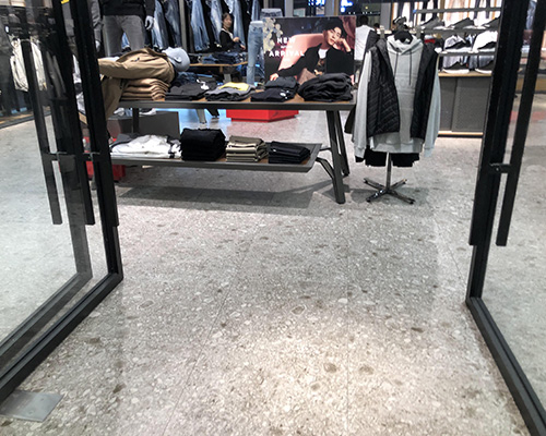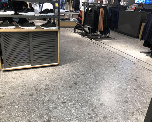 Esta tienda de marcas de moda masculina encarna un estilo minimalista e industrial, con baldosas grises de terrazo de 60x120 cm que cubren el piso. Los tonos elegantes de las baldosas complementan la ropa negra, blanca y gris en exhibición, creando una atmósfera atemporal y cohesiva.