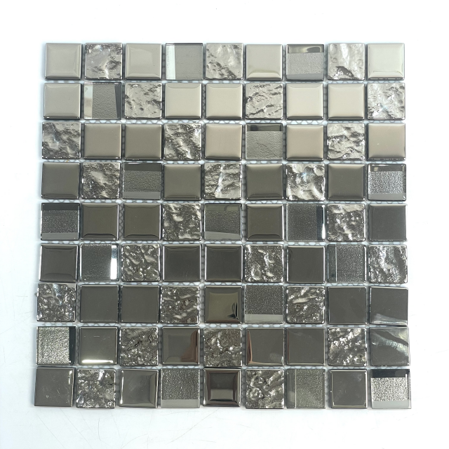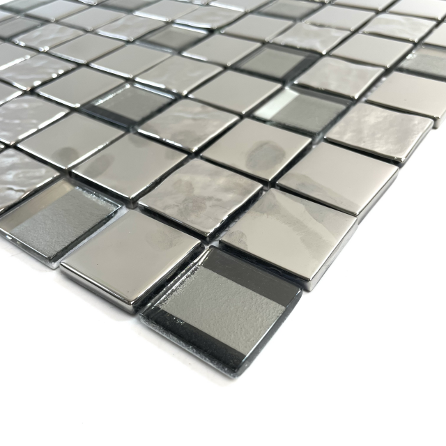 El mosaico de vidrio de plata es un mosaico decorativo premium y lujoso que a menudo se usa en proyectos de diseño interior y exterior para crear una superficie sofisticada y reflectante. Estas baldosas están hechas de vidrio recubiertas con materiales de color plateado o plata, a menudo con un acabado brillante o metálico. La combinación de las propiedades reflectantes del vidrio y el elegante brillo metálico de plata le da a los azulejos una apariencia única y glamorosa.