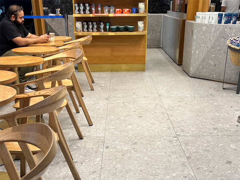 Las baldosas de terrazo, llenas de artesanía italiana, redefinen el ambiente de este icónico destino de café. Sus intrincados patrones y diseño original elevan la atmósfera, creando un entorno acogedor y elegante para que los clientes disfruten de sus momentos de café en medio de la vibrante energía del aeropuerto.