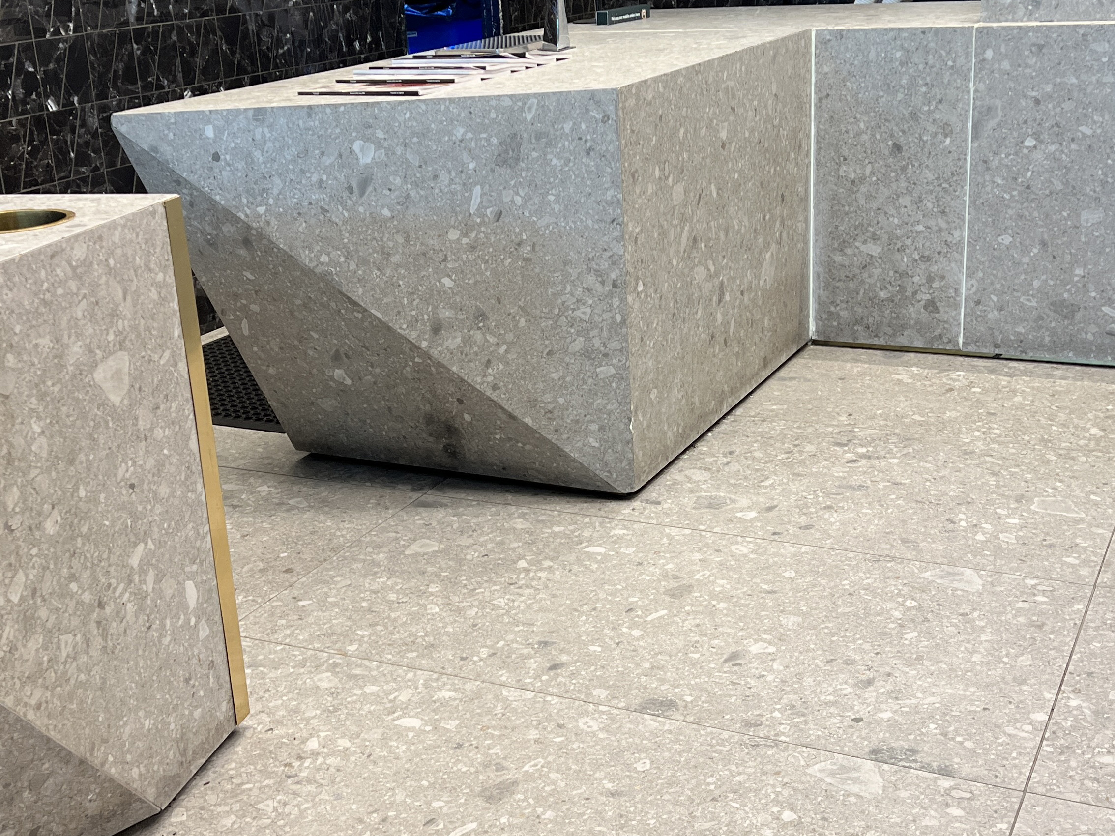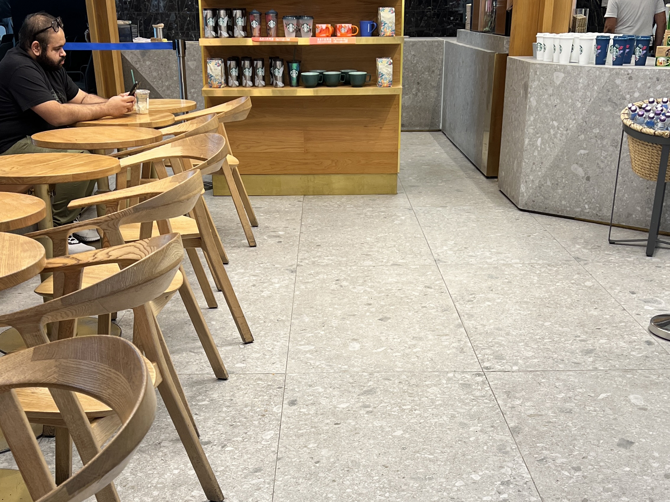 Las baldosas de terrazo, llenas de artesanía italiana, redefinen el ambiente de este icónico destino de café. Sus intrincados patrones y diseño original elevan la atmósfera, creando un entorno acogedor y elegante para que los clientes disfruten de sus momentos de café en medio de la vibrante energía del aeropuerto.